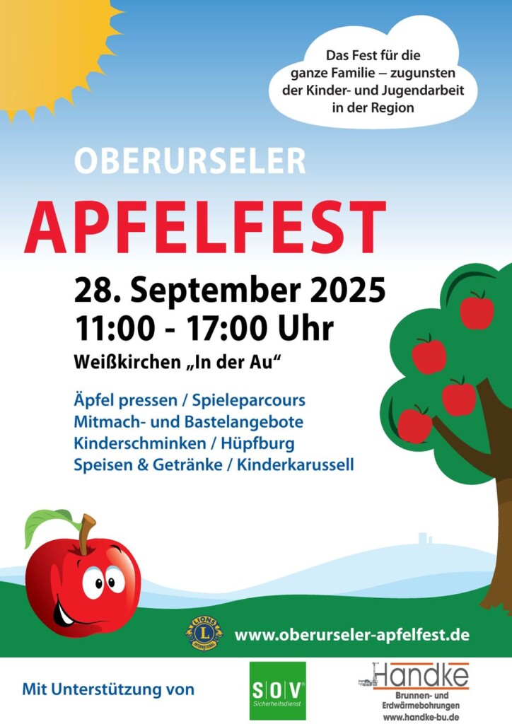 Der Lions Club Oberursel-Schillerturm führt am 28. September 2025 in Oberursel-Weißkirchen „In der Au“ wieder das Oberurseler Apfelfest durch.